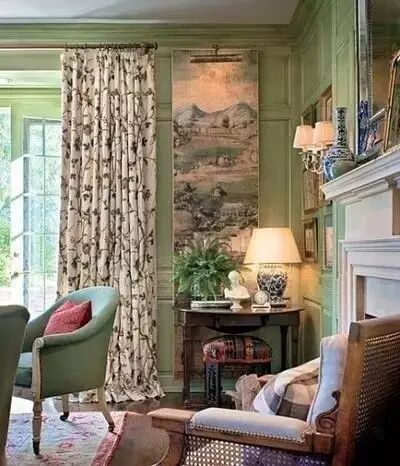 西方五行属”金“,按照五行生克理论,金克木为财。西向客厅下午西照的阳光强烈,尤其是夏季,光线刺眼,适宜选用清淡的绿色来调和。绿色原本就是代表大自然的颜色,在客厅装修中,以绿色为主基调,搭配上同样代表自然的原木棕色,可以营造出清新的田园风格。