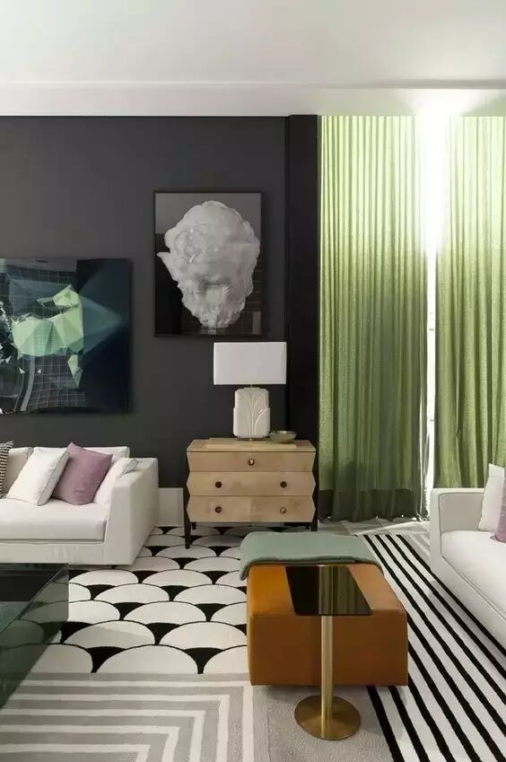 南方属火,不宜用诸如橘色、大红等暖色调来布置,用米白、纯白这样的白色系来消减“火气”,可让人舒适、清爽。白色总是会给人一种窗明几净的清新感,白色的墙能够更加衬托出黑色沙发的精致。