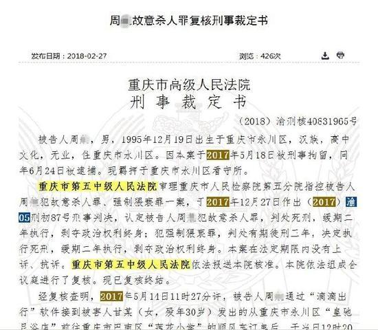 上游新闻重庆晚报慢新闻记者随后通过公开渠道查询到一份2018年2月27日发布的重庆市高级人民法院刑事裁定书。该裁定书目前已经生效。